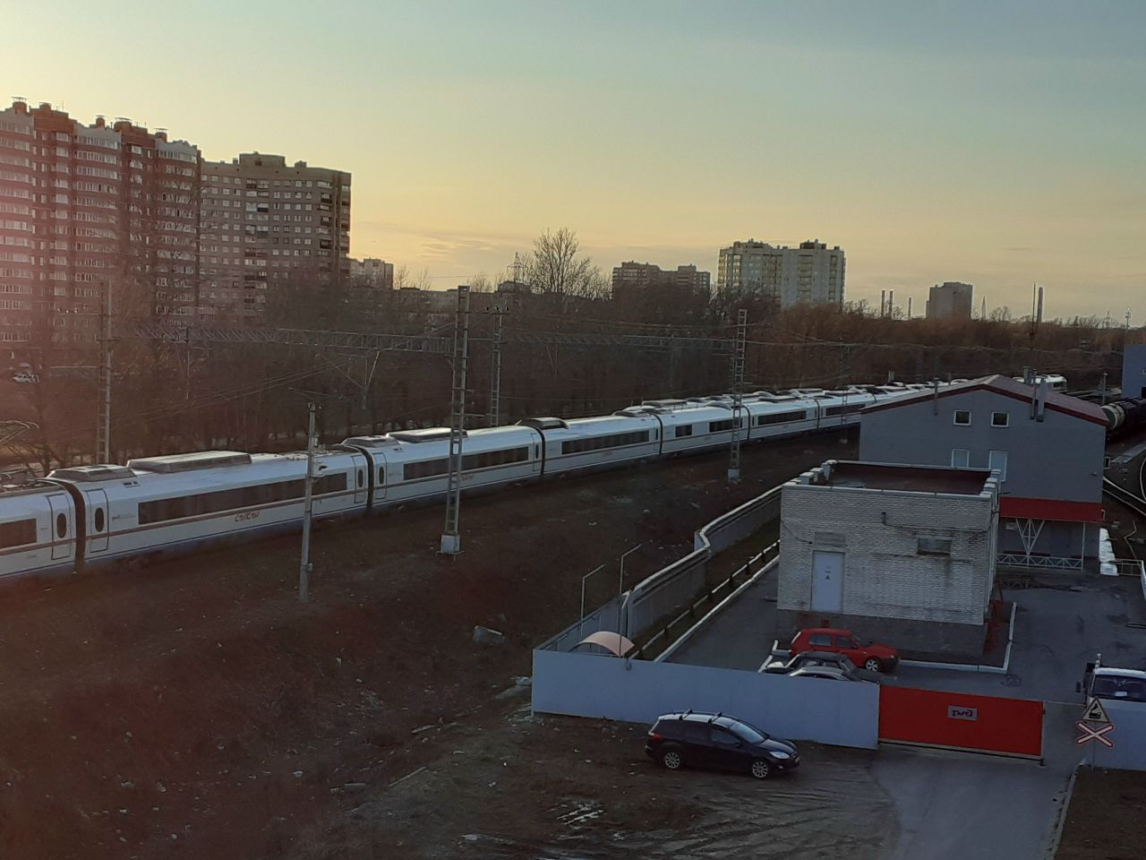 И тут же пронесся другой, идущий из Петербурга. На фоне заходящего солнца получилось очень красиво!